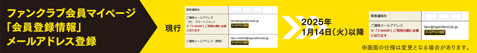 2025年1月14日(火)以降、「ご連絡メールアドレス(携帯)」に登録されているメールアドレスを「ご連絡メールアドレス」として登録いたします。また、試合結果メールおよびメールマガジンの配信希望につきましても「ご連絡メールアドレス(携帯)」「メールマガジン(携帯)」の希望条件を引継ぎます。