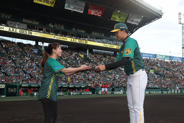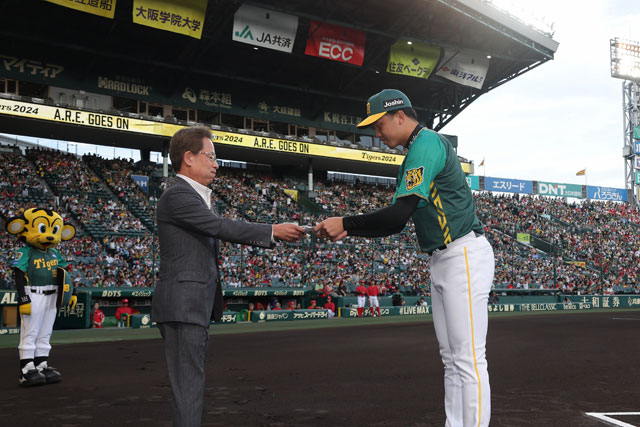 球団選定6月度月間最優秀選手に才木浩人選手が選ばれ、20日(土)、阪神甲子園球場での対広島東洋カープ戦の試合前に表彰式を行いました。