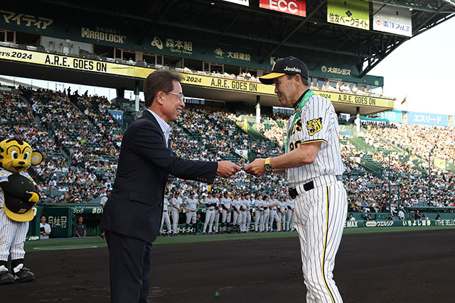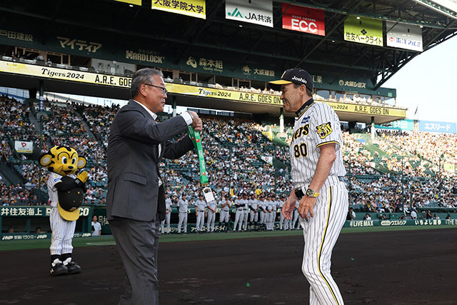 31日(水)、阪神甲子園球場での対読売ジャイアンツ戦の試合前に、6月27日(木)の対中日ドラゴンズ戦(阪神甲子園球場)で公式戦通算700勝を達成した岡田彰布監督の表彰式が行われました。