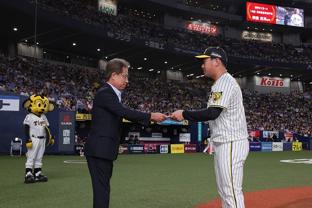 球団選定7月度月間最優秀選手に桐敷拓馬選手が選ばれ、21日(水)、京セラドーム大阪での対東京ヤクルトスワローズ戦の試合前に表彰式を行いました。