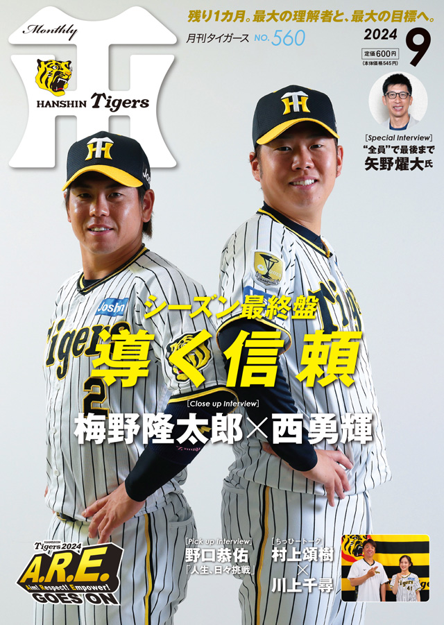 月刊タイガース9月号の表紙と巻頭インタビューには西勇輝投手と梅野隆太郎捕手が登場。長年バッテリーを組む二人の対談では、お互いの信頼感やコンビネーションの裏側をうかがうことができました。その他、野口恭佑選手のインタビューや村上頌樹投手とNMB48・川上千尋さんの対談、矢野燿大前監督の終盤戦展望など、今月もタイガース情報満載でお届けします。