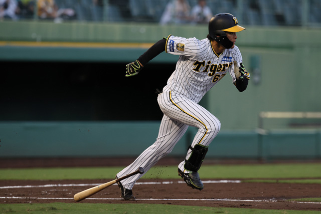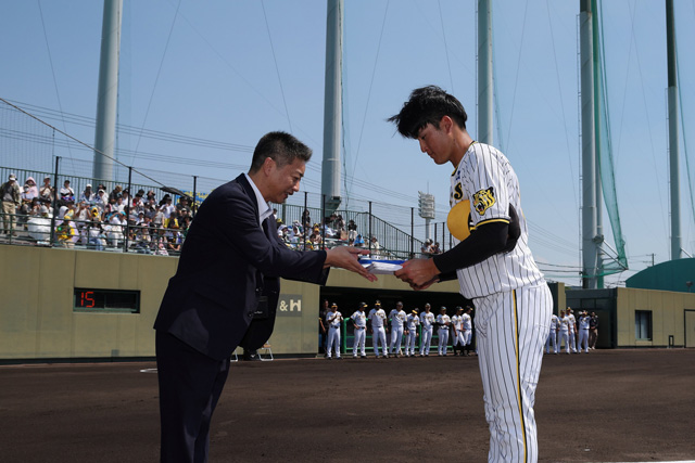 球団選定ファーム8月度月間最優秀選手に髙寺望夢選手が選ばれ、13日(金)、阪神鳴尾浜球場で開催したウエスタン・リーグ対くふうハヤテベンチャーズ静岡戦の試合前に表彰式を行いました。
