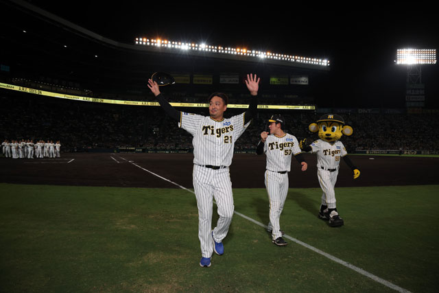 阪神タイガース一筋15年、この阪神タイガースで引退することを決めました。引退発表してから泣いてばかりで、次の涙は、タイガースのみんなに頑張ってもらって、日本一まで取っておきたいと思っています。この15年間、ファンの皆様には本当に温かい声援をいただき、15年頑張れたと思います。これからは後輩たちが一生懸命阪神タイガースの伝統を守っていってくれると思うので、また熱い声援をよろしくお願いします。15年間ありがとうございました。
