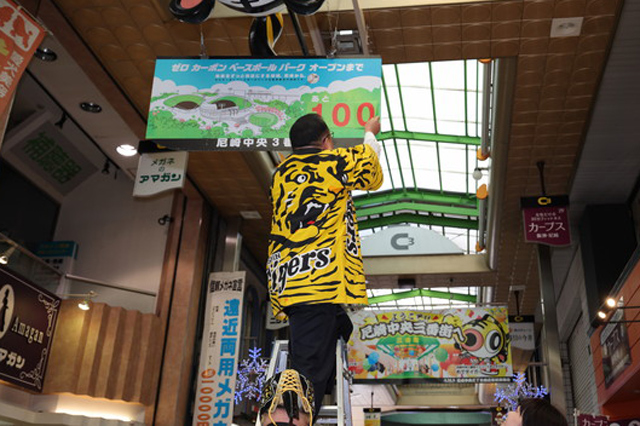 セレモニーでは、同商店街の名物でもある「日本一早い優勝マジックボード」に、ゼロカーボンベースボールパークの開業カウントダウンボードが設置され、開業100日前となる本日からカウントダウンが開始されました。