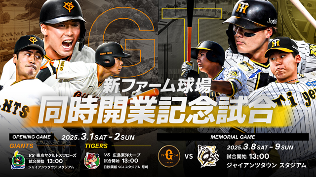 阪神タイガースと、読売巨人軍は、2025年3月1日(土)に、ファーム新本拠地である「日鉄鋼板 SGLスタジアム 尼崎」(兵庫県尼崎市)、「ジャイアンツタウン スタジアム」(東京都稲城市)を同時開業し、「新ファーム球場同時開業記念試合」として、それぞれの新本拠地にセ・リーグ球団を迎え、「オープニングゲーム」を開催いたします。また、翌週の3月8日(土)、9日(日)には、「ジャイアンツタウン スタジアム」にて、両球団同士による「メモリアルゲーム」(読売巨人軍主催)を開催します。