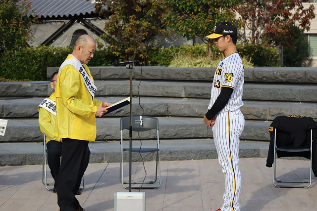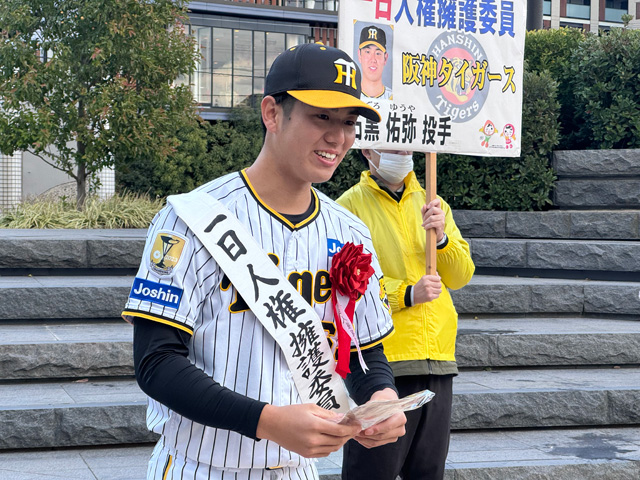 5日(木)、石黒佑弥選手が「第76回人権週間」の一日人権擁護委員を委嘱され、阪神出屋敷駅前の街頭にてキャンペーン活動を行いました。