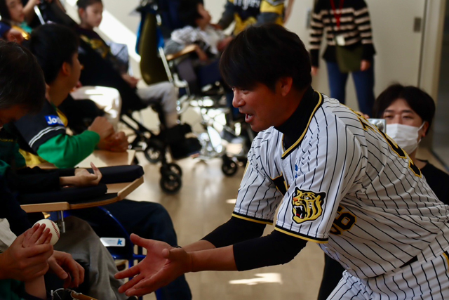 6日(金)、川原陸選手、井上広大選手、筒井壮コーチが、西宮市立西宮支援学校を訪問しました。児童生徒の皆さんから歓迎を受けて登場した選手達は、質問コーナーやキャッチボールなどで児童生徒の皆さんとふれあいました。