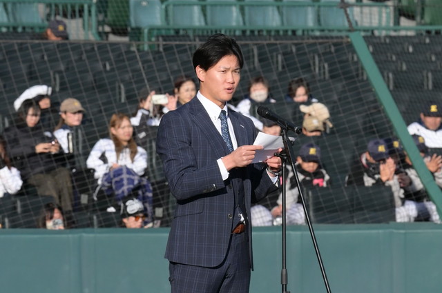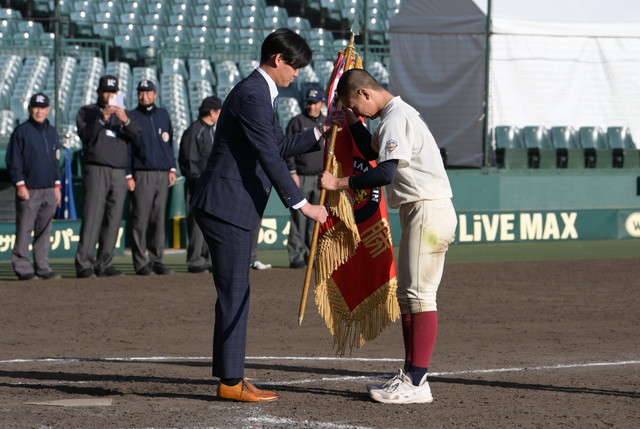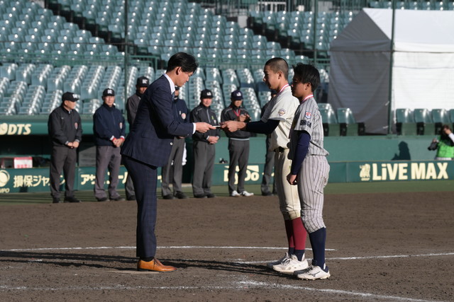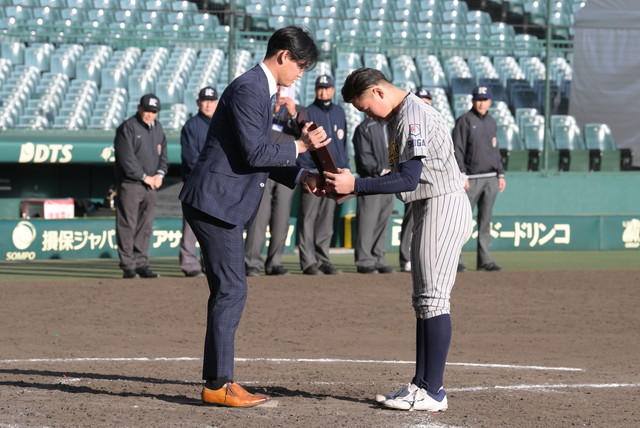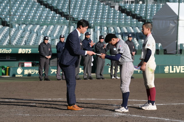 決勝戦終了後に行われた表彰式には、及川雅貴選手がプレゼンターとして登場し、優勝した北摂リトルシニアには優勝旗とタイガースカップが、準優勝の湖南ボーイズには準優勝盾が贈られました。