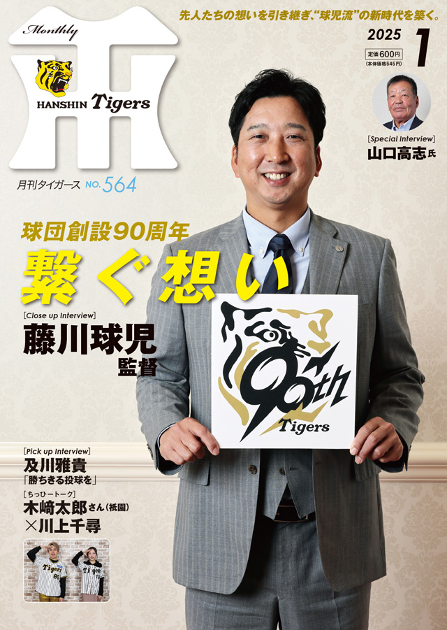 月刊タイガース1月号の表紙と巻頭インタビューには、藤川球児新監督が登場。球団創設90周年を迎える新シーズンや将来に向けた展望、チームに残留した大山悠輔選手への思いも語っていただきました。また、スペシャルインタビューでは藤川監督の恩師、山口高志元コーチに、藤川監督現役時代のエピソードを語ってもらったほか、及川雅貴投手のインタビュー、NMB48・川上千尋さんと祇園・木﨑太郎さんの対談、新人選手入団発表会の模様も掲載。オフシーズンもタイガース情報満載でお届けします。