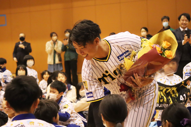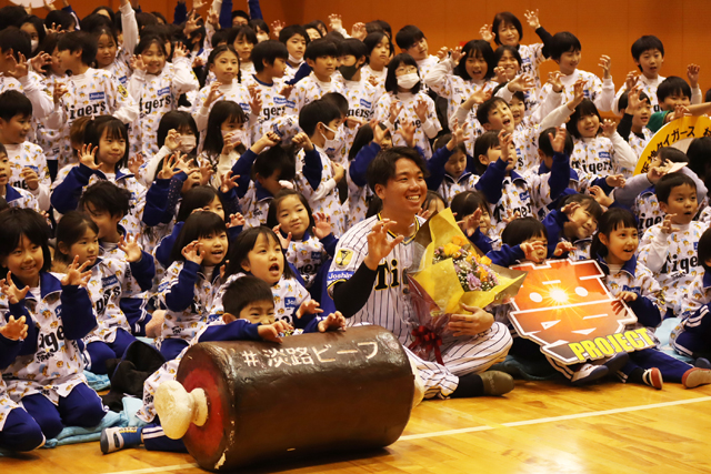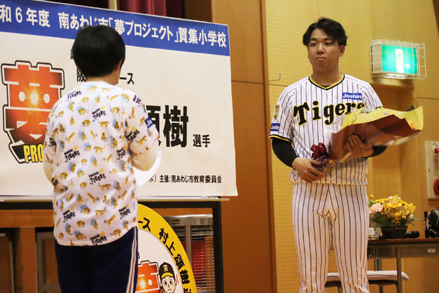 19日(木)、村上頌樹選手が、南あわじ市教育委員会主催イベント「夢プロジェクト」の一環で、母校である賀集小学校を訪問し、トークショーや記念撮影などで児童の皆さんとふれあいました。