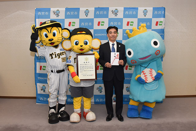 阪神タイガースを代表して贈呈式に参加したトラッキー・キー太へは、石井登志郎西宮市長より感謝状が授与されました。
