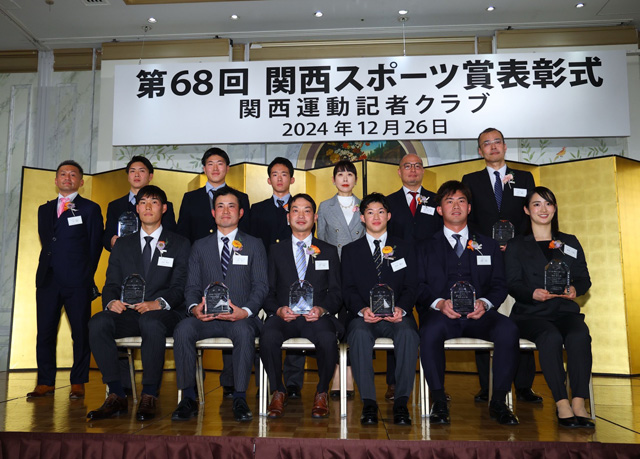 関西運動記者クラブ選定「第68回 関西スポーツ賞」の表彰式が、26日(木)に大阪市内のホテルにて行われ、「特別賞」を受賞した桐敷拓馬選手が参加しました。また、前監督の岡田彰布オーナー付顧問が「功労賞」を受賞されております。