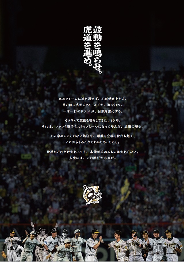 阪神タイガースは2025年に球団創設90周年を迎えました。これまでの一歩一歩の歴史を重んじながら、野球という文化を次世代に繋いでいく決意を表明すべく、2025年シーズンに向け、90周年記念ロゴとキャッチコピー「鼓動を鳴らせ。虎道を進め。」を策定し、昨年発表いたしました。