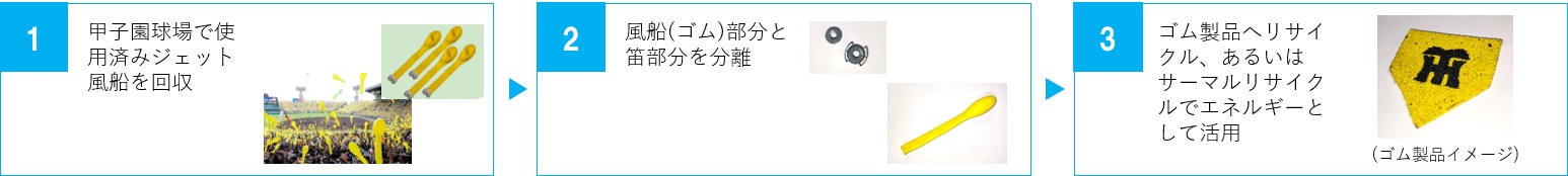 この実証実験は、ジェット風船を膨らませるために専用のポンプが必要なものとして周囲の飛沫対策を施すほか、球場内に新たに回収ボックスを設置し、使用済みのジェット風船の回収と再資源化に努めます。さらに、空気注入部分(笛)の素材にペットボトルキャップの再生材(甲子園球場内で回収したペットボトルキャップも一部使用)を使用して環境にも配慮したうえで実施します。