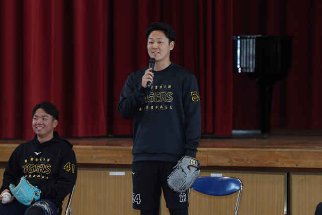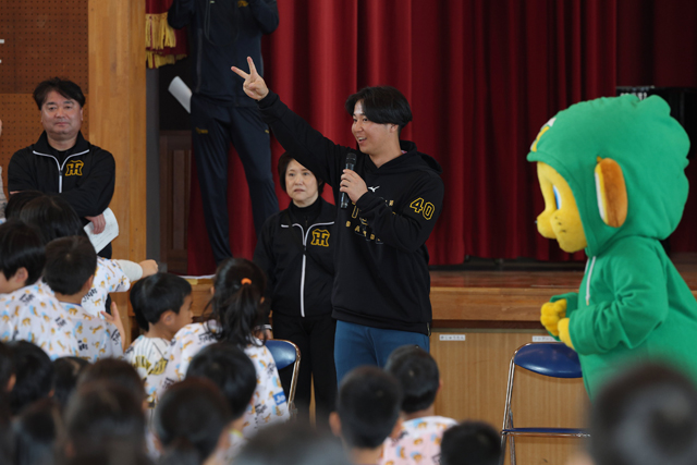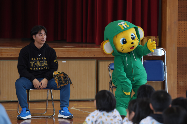 30日(火)、 中野拓夢選手、村上頌樹選手、茨木秀俊選手、井坪陽生選手、木下里都選手とキー太が、春季キャンプ地である沖縄県宜野座村の宜野座村立宜野座小学校を訪問しました。266名の生徒の皆さんが参加された交流会では、質問コーナーやじゃんけん大会などで楽しい時間を過ごしました。