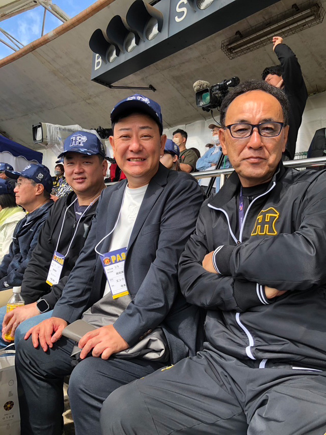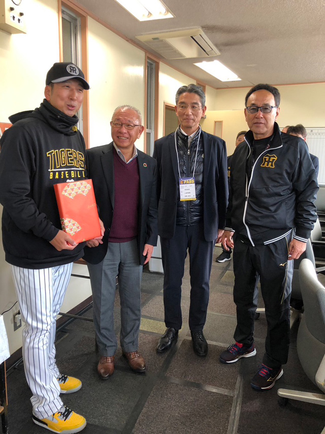 オフィシャルスポンサーである上新電気株式会社の金谷代表取締役兼社長執行役員、高橋代表取締役兼副社長執行役員が宜野座キャンプにご来場され、木戸監督がご挨拶させて頂きました。