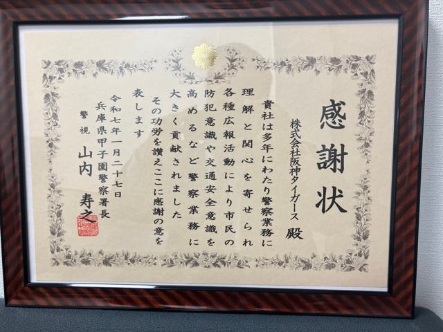 27日(月)、これまでの各種広報活動により警察業務に大きく貢献したとして甲子園警察署から阪神甲子園球場と当球団へ感謝状が贈呈されました。