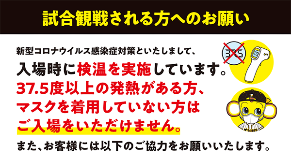 - ■球場内ではこまめな手洗いや手指消毒、咳エチケットの遵守をお願いします。
