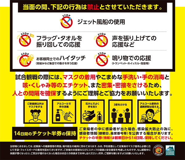 また、応援メガホンを叩いての応援は可能ですが、声を張り上げての応援は、当面の間禁止とさせていただきます。 - ■ご入場後は入場券記載の座席にご着席ください。また、球場内の移動は売店・トイレ等できるだけ最低限に留め、不要なご移動はお控えください。